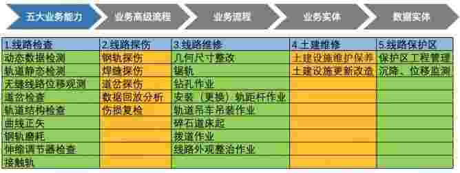 在轨道运维业务中,,,,我们形成了完整的从业务能力(业务域)-业务流程-业务实体-数据模型的分析梳理过程。。。轨道运维业务能力如下图所示:::