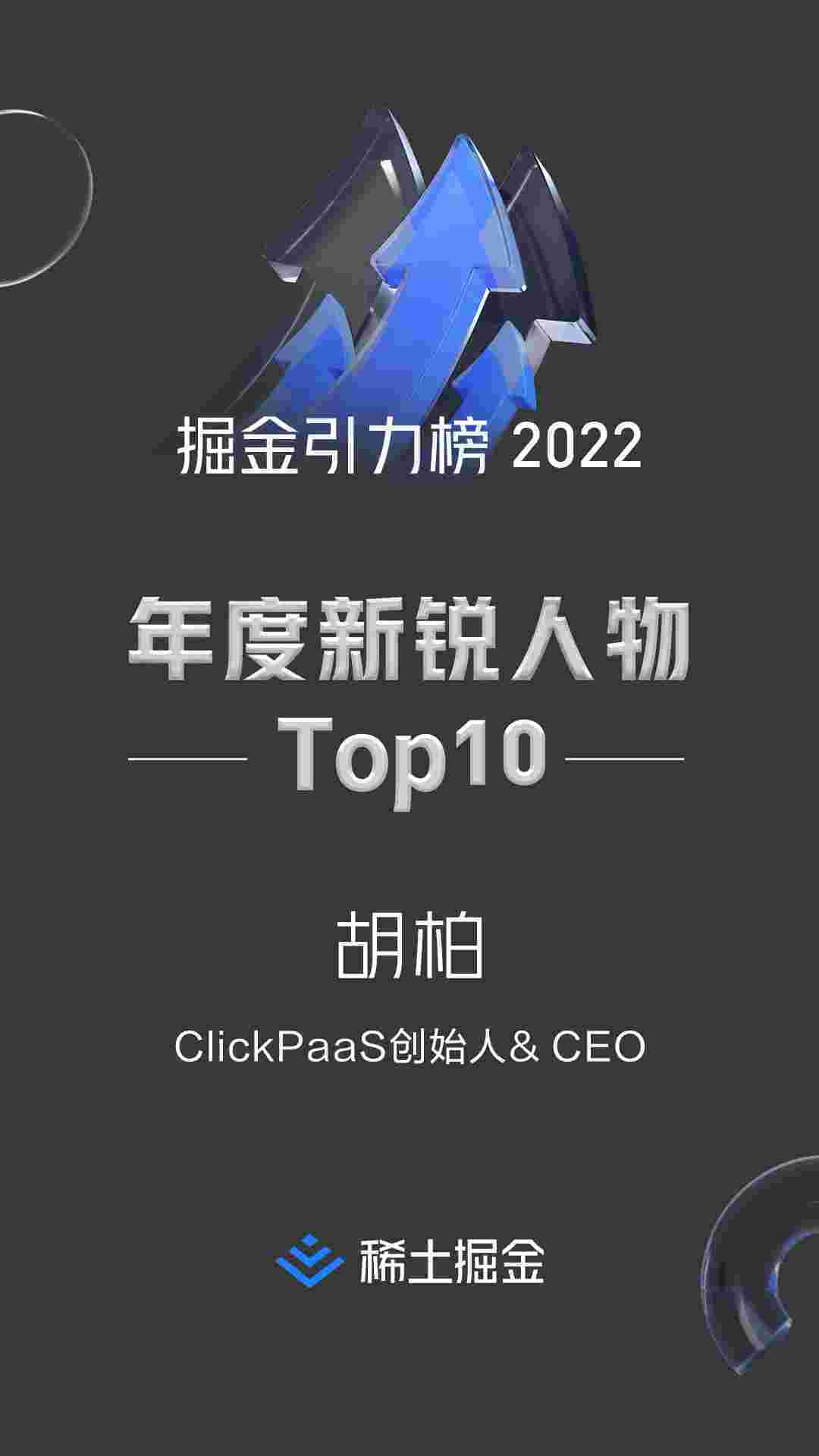 2022年1月6日,,,稀土掘金社区第一届「掘金未来大会」成功举办,,,,会上发布了“2022 稀土掘金引力榜 年度新锐人物”榜单,,,,上海爱湃斯科技有限公司(简称美团钱包商家版)创始人及CEO胡柏实力入选年度新锐人物TOP 10。。。。